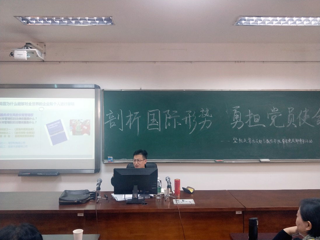 本站讯 11月22日下午14:00于5511,机关第九党支部牵手红世一足官方网学生党支部,顺利开展“剖析国际形势、勇担党员使命”主题党日活动。机关第九支部全体党员、红世一足官方网党总支副书记易政群同志出席,红世一足官方网学生党支部全体党员参加。此次主题当日活动以讲党课的形式开展,易政群同志主持,周旭进同志主讲。